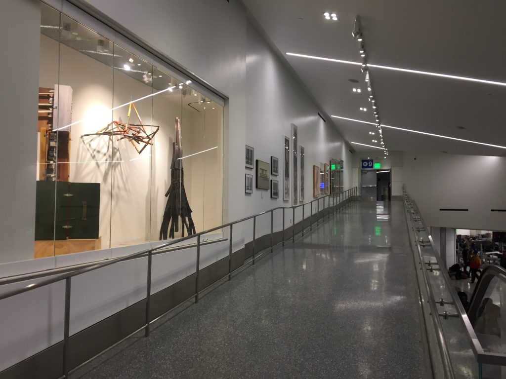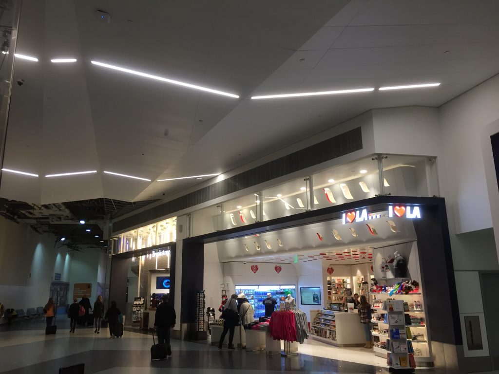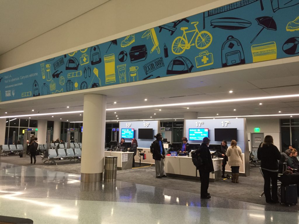 Although Southwest is still a budget carrier, its transformed terminal at LAX looks and feels like an upscale shopping mall. The old ticket counter area is now the new expanded state-of-the-art security area, and the former offices behind the ticket counter have been moved to the mezzanine area upstairs. There are now large glass windows greeting travelers all over the terminal, and passengers are guided to their gates with winding ribbons of LED lights overhead and terrazzo floor beneath.