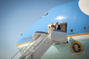 President Donald J. Trump waves as he exits Air Force One at MacDill Air Force Base, Feb. 6, 2017. President Trump flew to MacDill to visit with senior officials at USCENTCOM to discuss issues affecting USCENTCOM’s 20-nation area of responsibility. (Photo: U.S. Air Force photo by Staff Sgt. Ned T. Johnston)