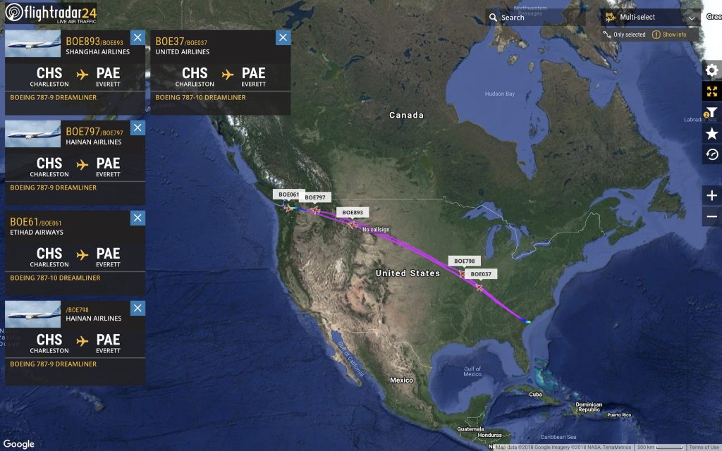 In addition to these two planes, Boeing also sent three Hainan Airlines 787-9s (B-1132, B-1133, and B-1138) and one Shanghai Airlines 787-9 (B-1111) to Paine Field. These planes have been parked at available slots on the Everett flight line, waiting to go back to Charleston. Because the South Carolina plant closed on Tuesday, it is unlikely that more 787s will migrate to avoid the storms on Wednesday.