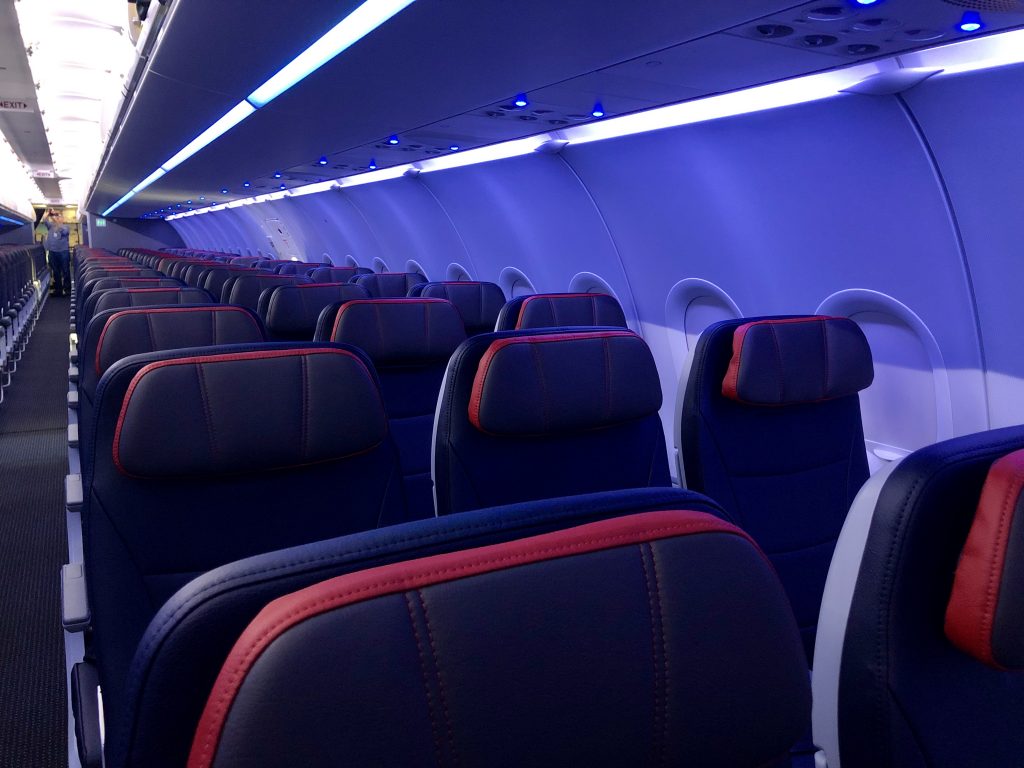 In addition to a new overhead bin design, American’s A321neo features mood-lighting, including new ‘under-bin’ lights that run the length of the cabin.