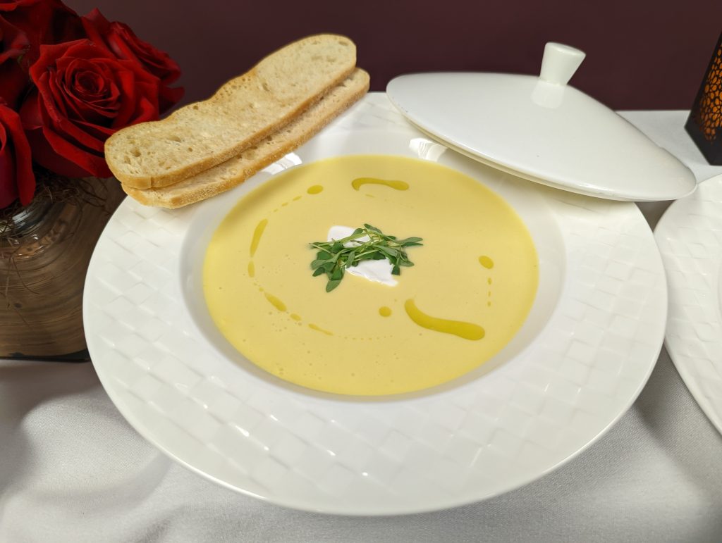 This was followed by a wholesome soup, corn and jalapeno soup topped with Crème Fraiche.