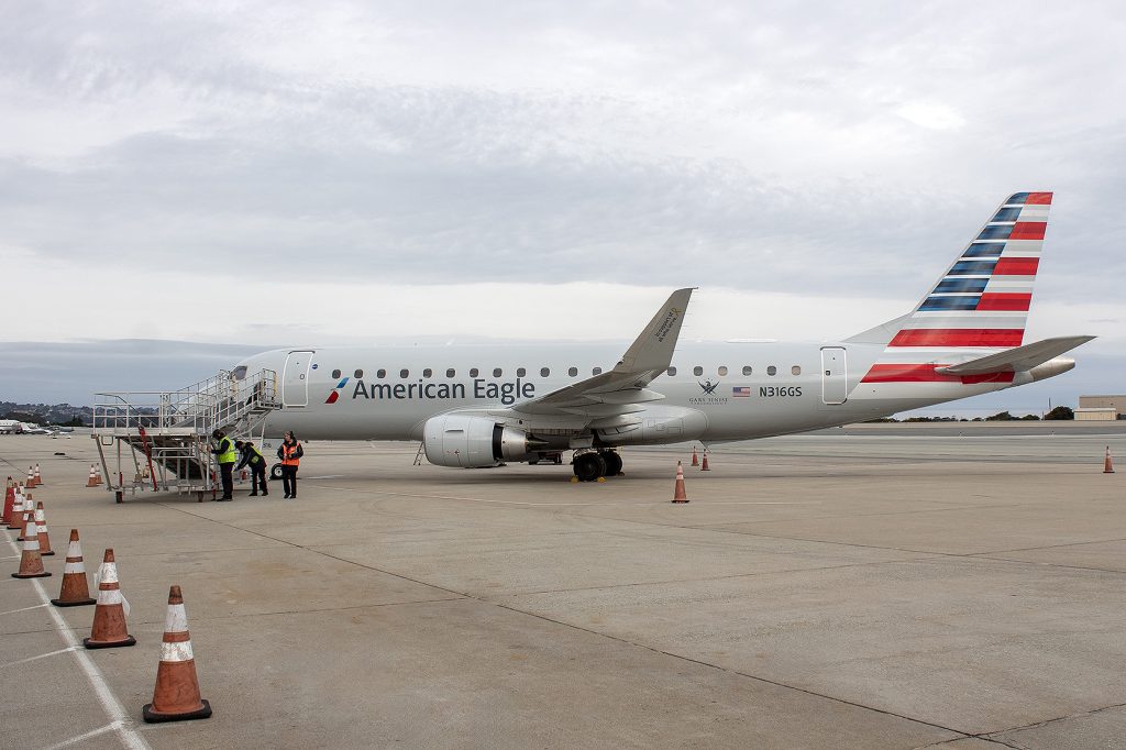 The Embraer E175 features custom-made decals, interior signage, winglet designs, and a unique registration number, N316GS. Representatives from American and Envoy presented the surprise dedication to actor and humanitarian Gary Sinise earlier this year, ahead of a Lt. Dan Band charter flight departing from Los Angeles.