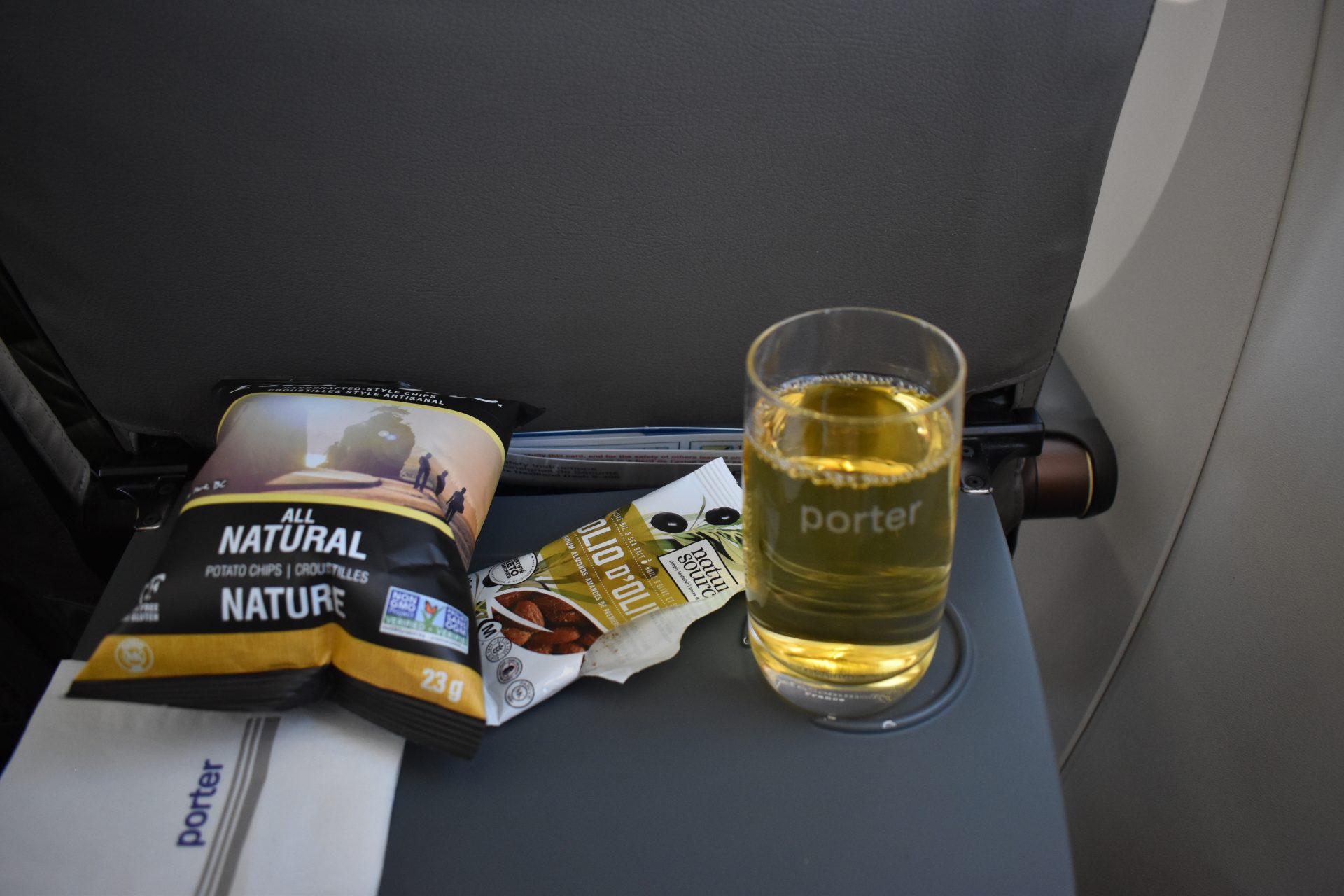 It didn’t take long for us to get up to a cruising altitude of 24,000 feet/7315.20 meters, and the crew began the in-flight beverage and snack service. One of the things Porter became known for was its elevated economy experience, including the use of glassware, which it continues to use to this day on board all of their flights, even short journeys on the turboprop Q400s.