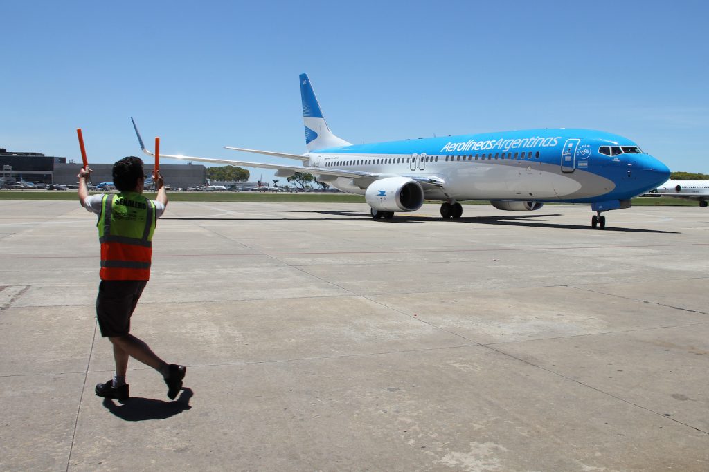 The livery’s lettering spells out “Aerolíneas Argentinas” in a bold blue font across the forward fuselage. Near the cockpit windows, a small Argentine flag is displayed. The airline has applied this design across its modern fleet, which includes Boeing 737s and Airbus A330s, ensuring consistency throughout its domestic and international network.