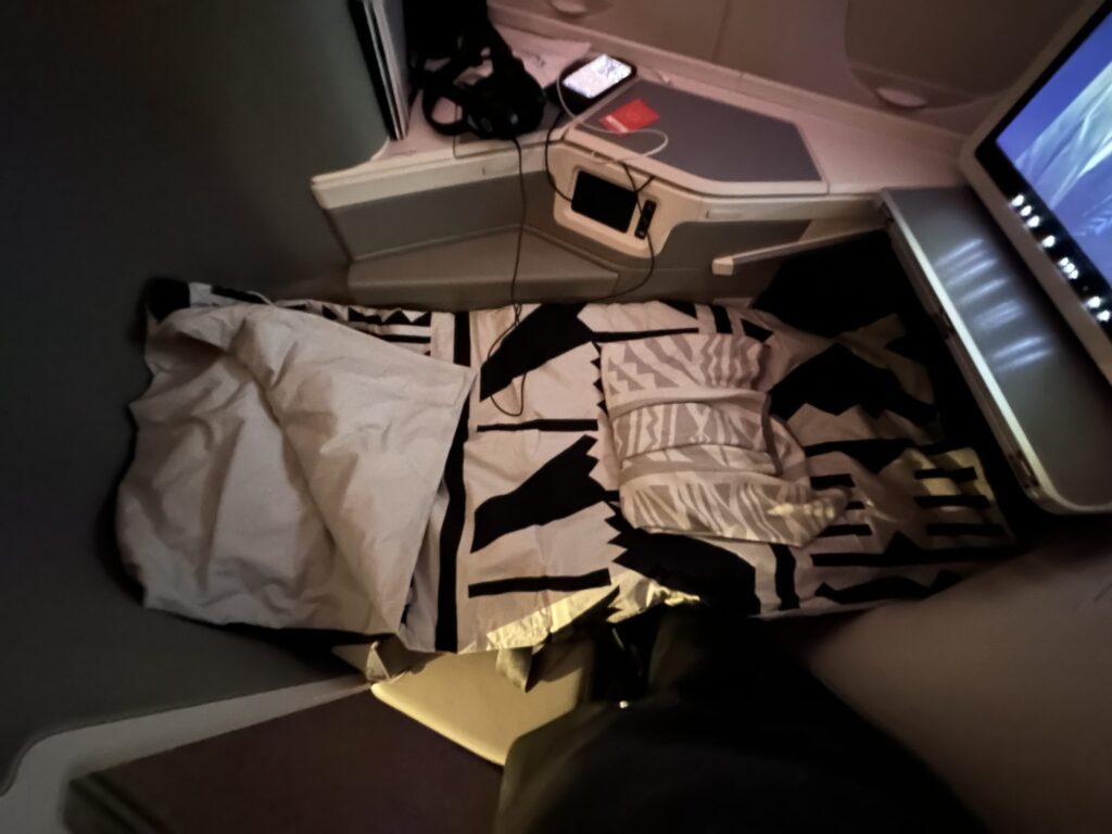 Another personal touch from the airline: while I was up using the restroom getting ready for bed, I came back to see that my seat/bed had been made up for sleeping by the flight attendants with the comforter that we were given before leaving the gate, in addition to another thicker comforter.