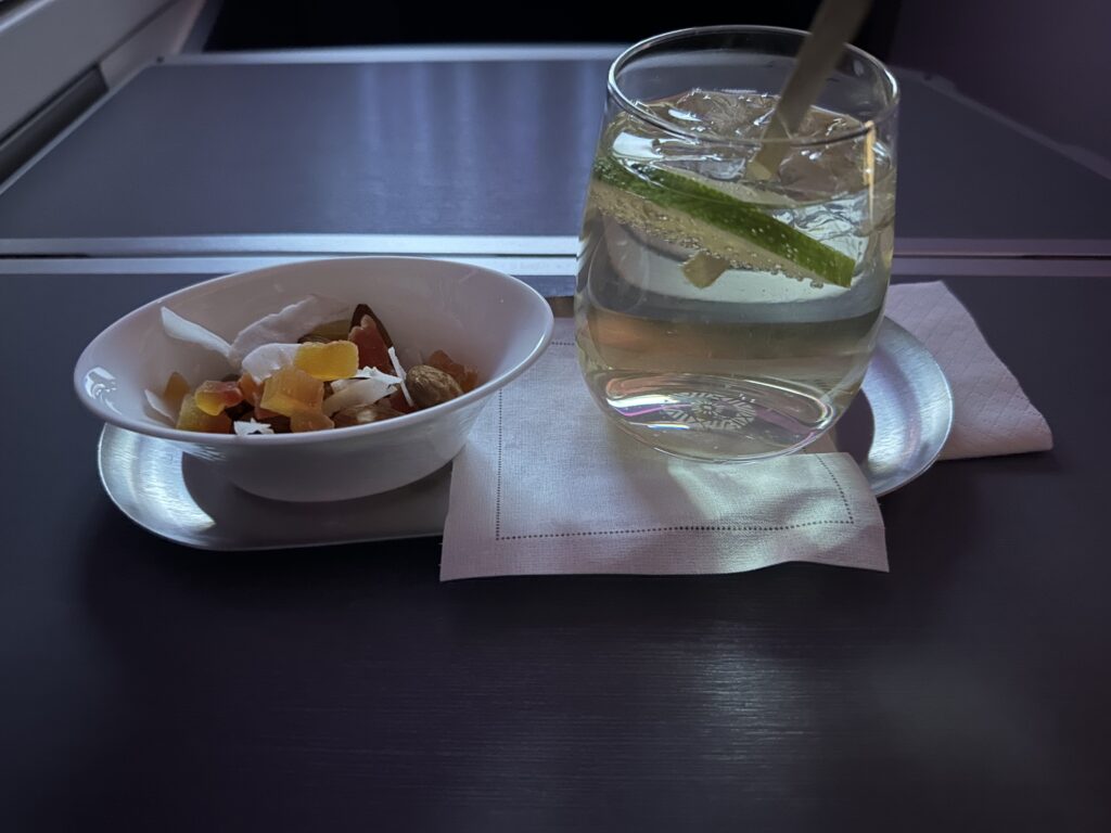 Before pushing back, the flight attendants came around with a lavender hot towel as well as either fruit juice or champagne for everybody in business class. Despite starting the boarding process late, we were able to make up some time with a quick and efficient boarding process. We pushed back from the gate on time and took off into the night skies.