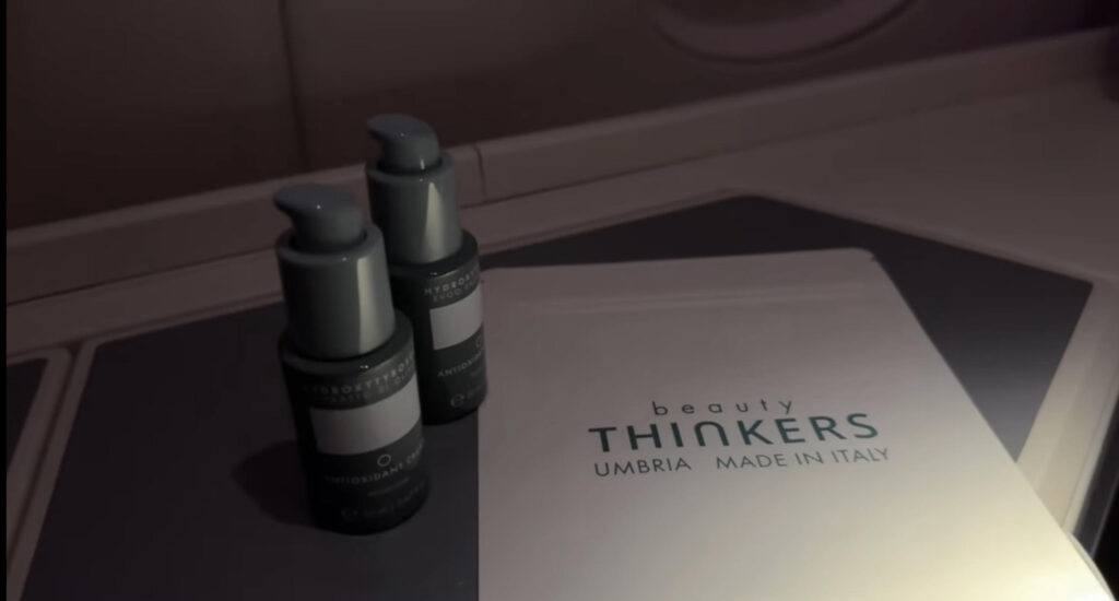 One of the things from the kits you can ask for is hand lotion and moisturizer from Umbria, which is made in Italy. The products are handed out in zip-lock bags, which you can bring with you and on your next flight, since they are all travel-sized.