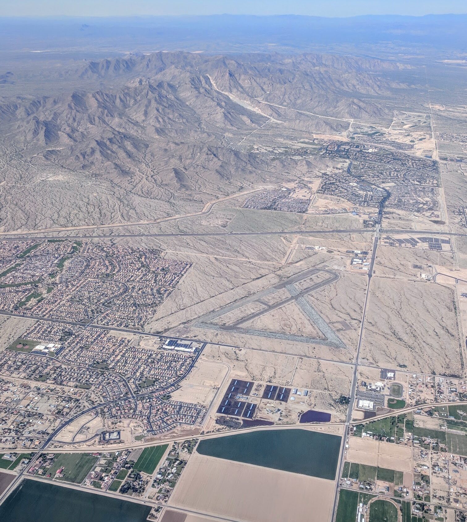 The northeast corner of Buckeye, Arizona, with the abandoned Goodyear Field between the Roosevelt Irrigation District main canal and Interstate 10. (Photo: Dicklyon, CC BY-SA 4.0 https://creativecommons.org/licenses/by-sa/4.0>, via Wikimedia Commons)